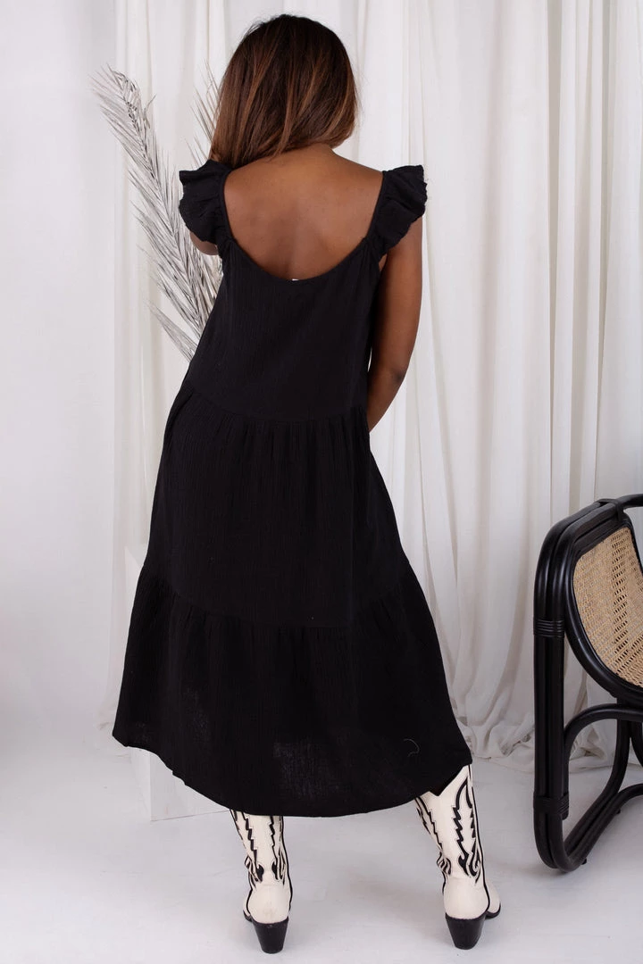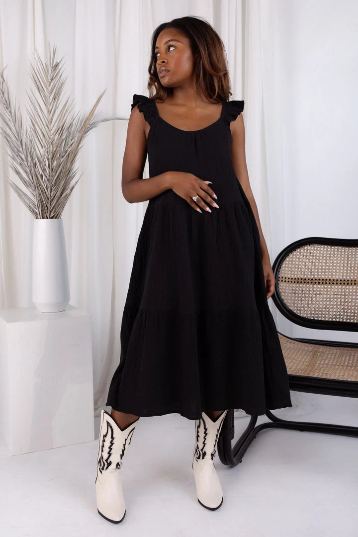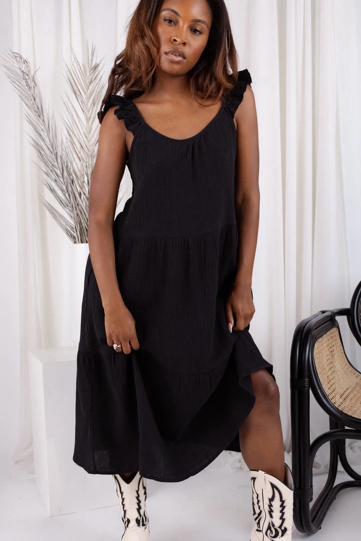 The Little Moments Tiered Midi Dress is the dress that will always remind you of that summer beach night you never want to forget. Pair with your fav gold jewelry and jean jacket for a beach chic look.