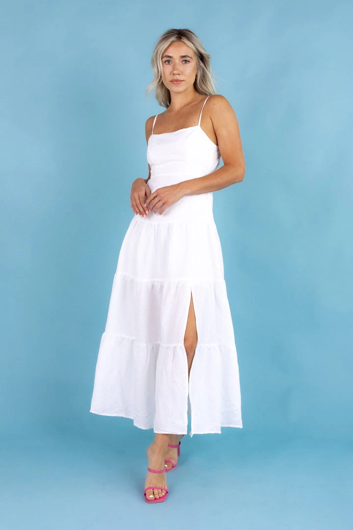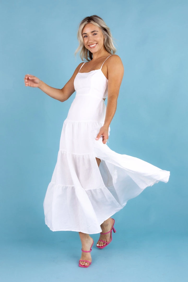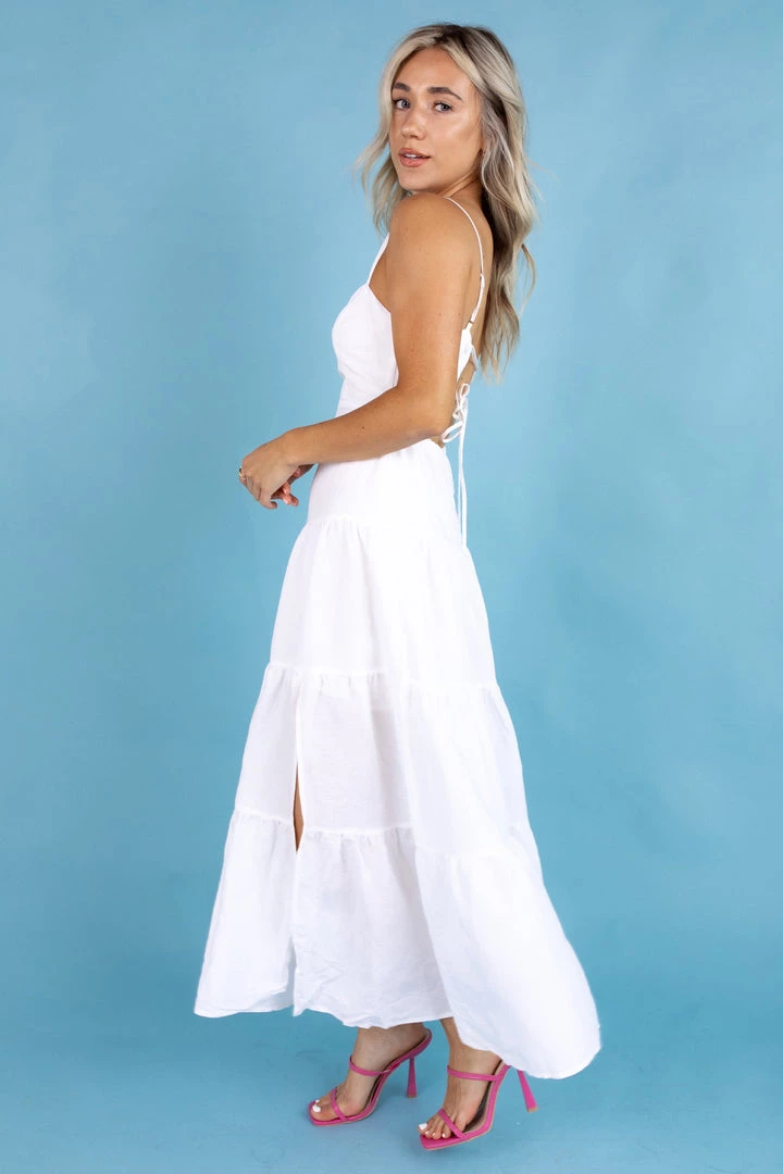 The ASTR Temecula Dress will have you looking and feeling so effortlessly gorgeous. The linen blend dress is a midi length keeps it classy but the front slit and open back add the perfect amount of sexy.