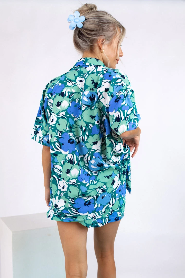We are loving the Flipside Floral Button Down Shirt for its fun floral detail and cool color palette. Complete the look with the Flipside Floral Mini Skirt and chunky sandals.