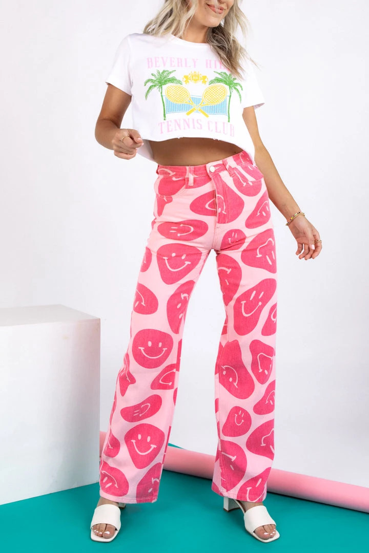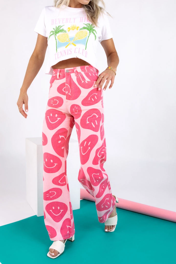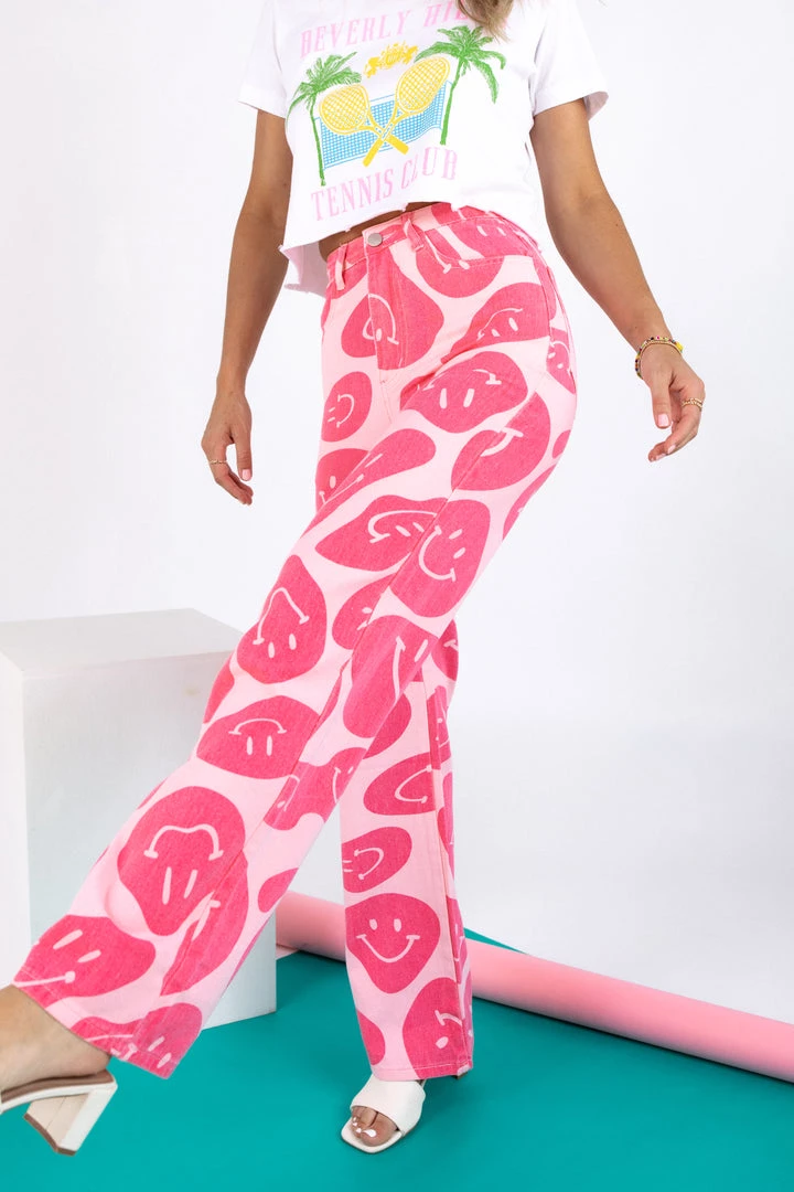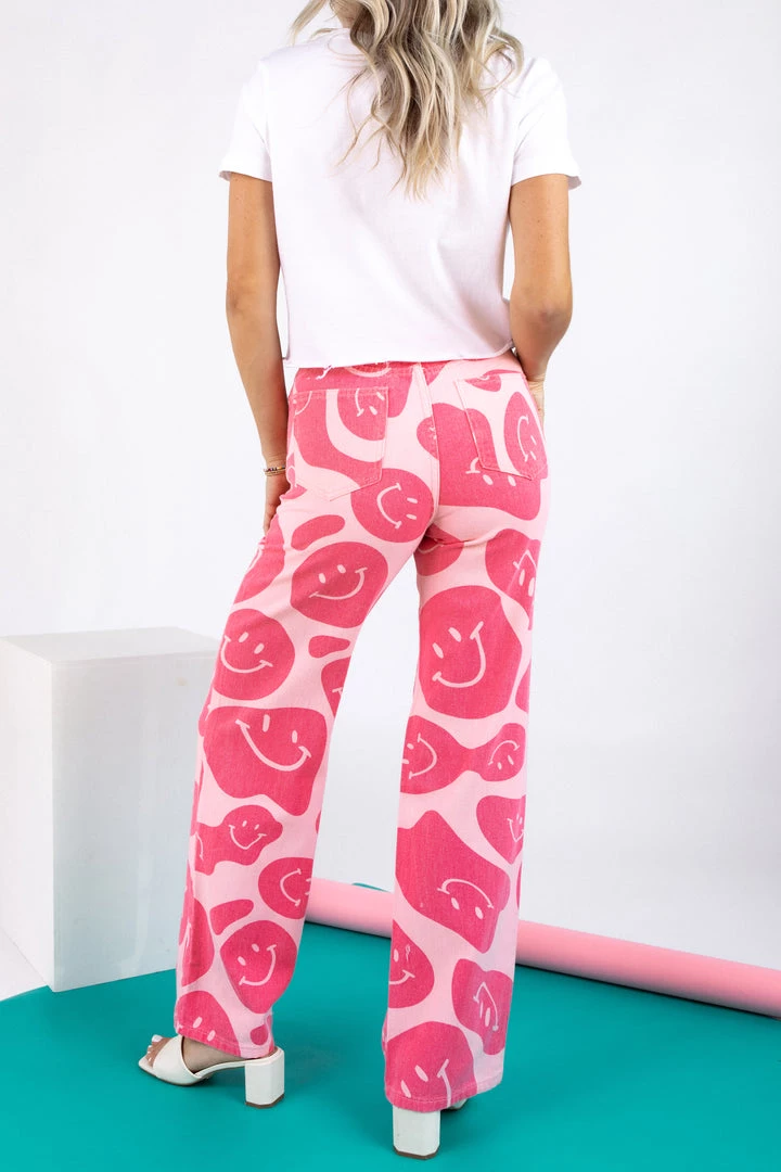 Smile and wave in the Fortune Wavy Smile Pants! Featured in a wide leg fit with functional pockets and a smiley pattern, these happy pants will have you walking around town like you own it.