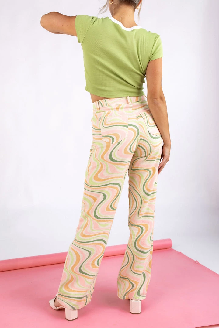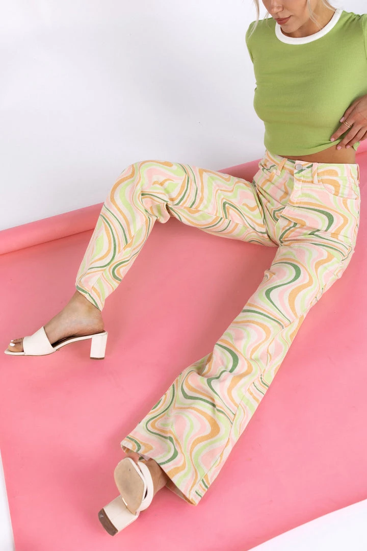 The Honeydew Wave Print Pants will have you looking totally groovy. Featured in a multi-color wave pattern and a straight-leg fit, these pants scream summer. Pair with your favorite tank and chunky sunnies.