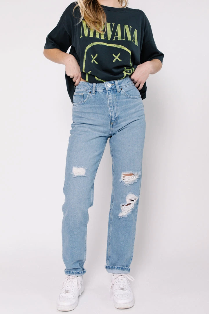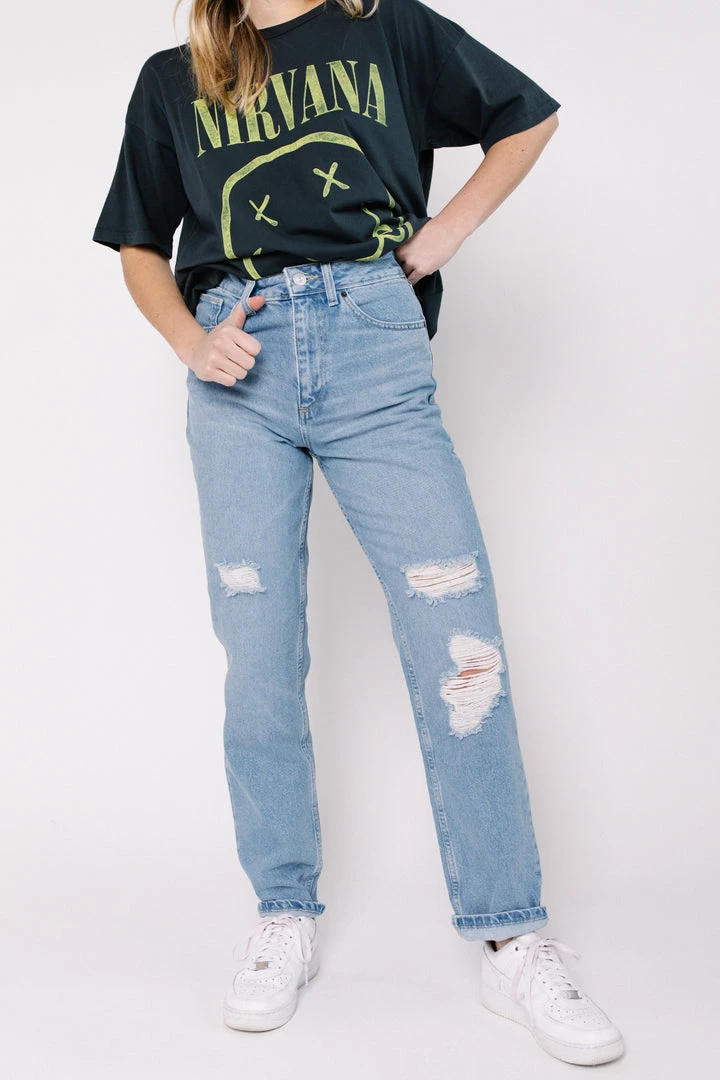 Vintage-inspired high-rise BDG Mom jean crafted from distressed rigid denim that will soften more and more over time. Cut high at the waist, relaxed through the hip and tapered through the leg so you can wear them long or rolled. 5-pocket styling with a zip fly.