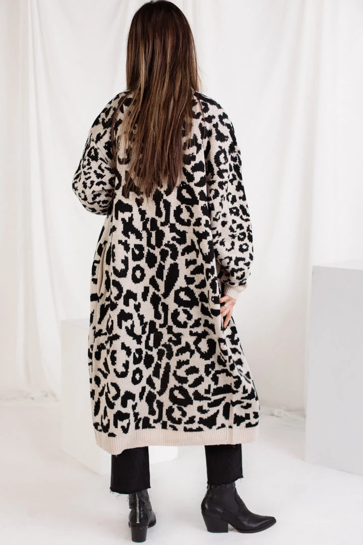 The perfect cardigan featured in a neutral leopard print. So cozy for with dropped sleeves and open front style.