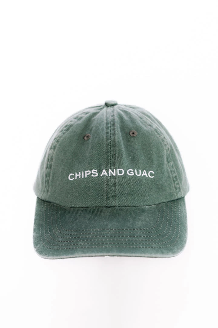 Distressed baseball hat featuring “Chips And Guac” on the front