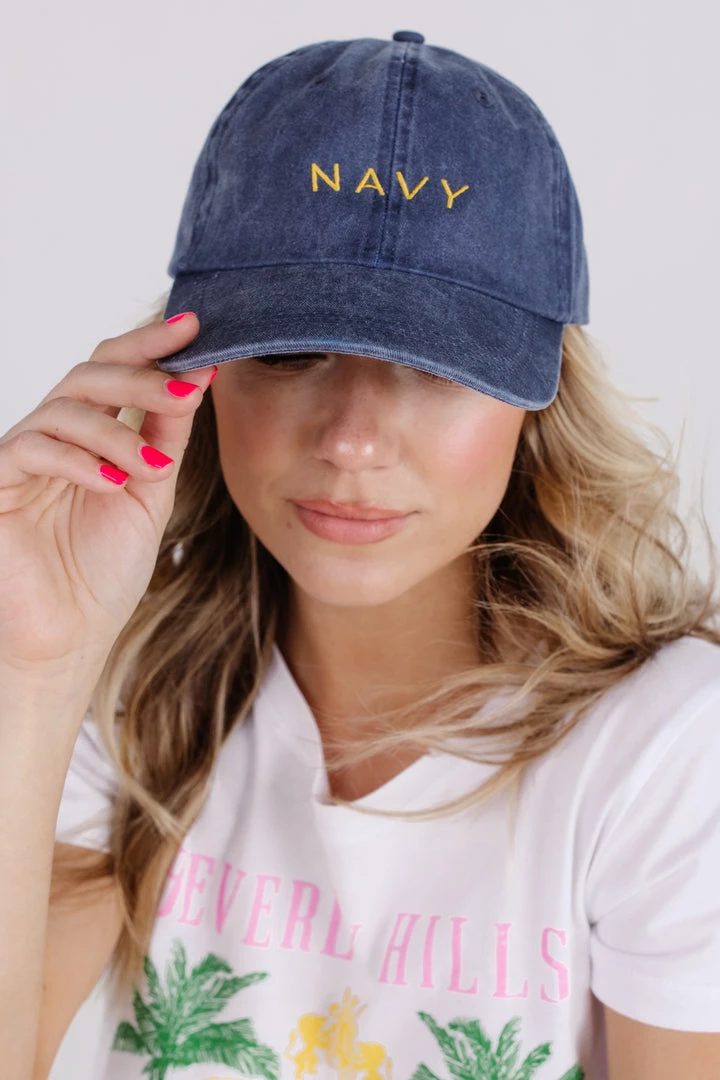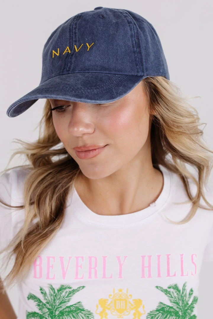 The BRIGHTSIDE The Label Navy Hat is perfect for everyday wear. Featured in an adjustable, hideaway strap closure with a metal d-ring slider buckle and embroidered with “navy”.