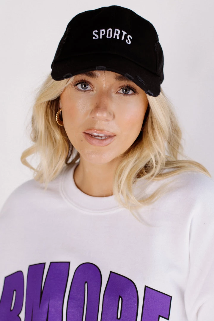 Distressed baseball hat featuring “sports” on the front