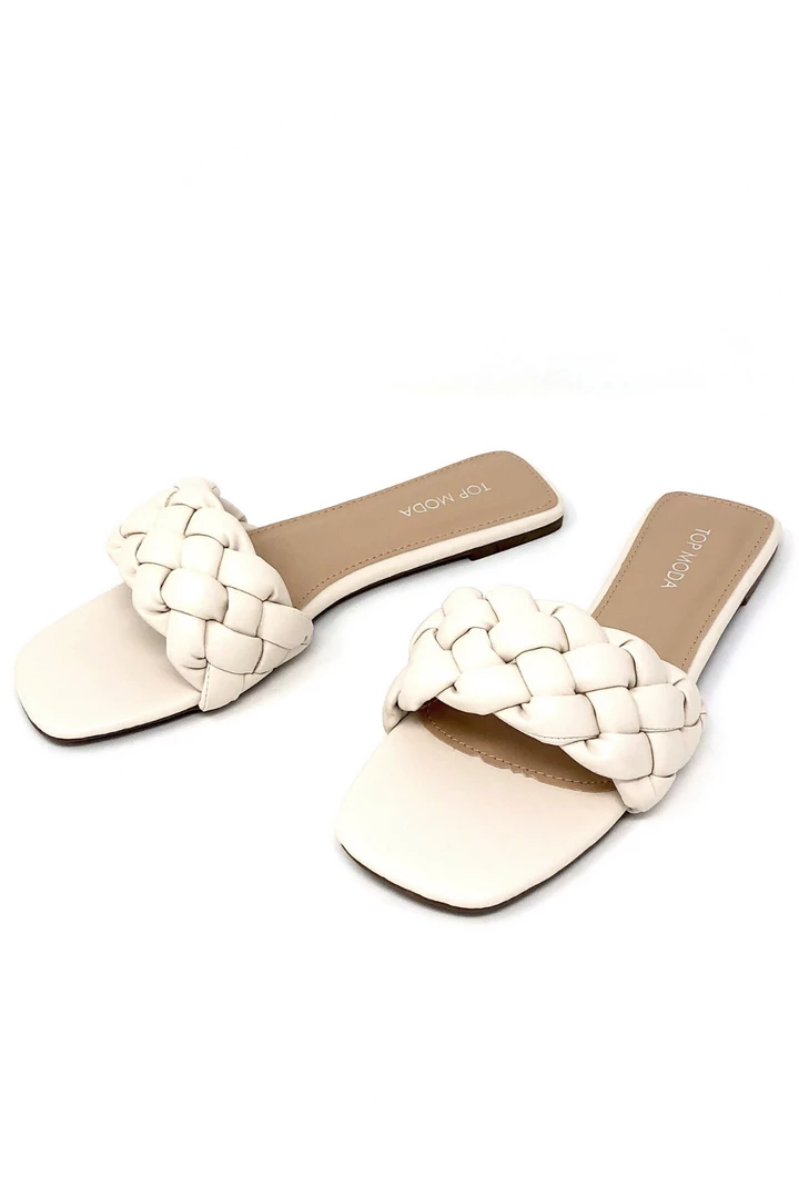 Lush vegan leather slide sandals with a gorgeous braided weaved textured foot cover. A lovely upgrade of the classic slide sandal that works with anything in your closet!