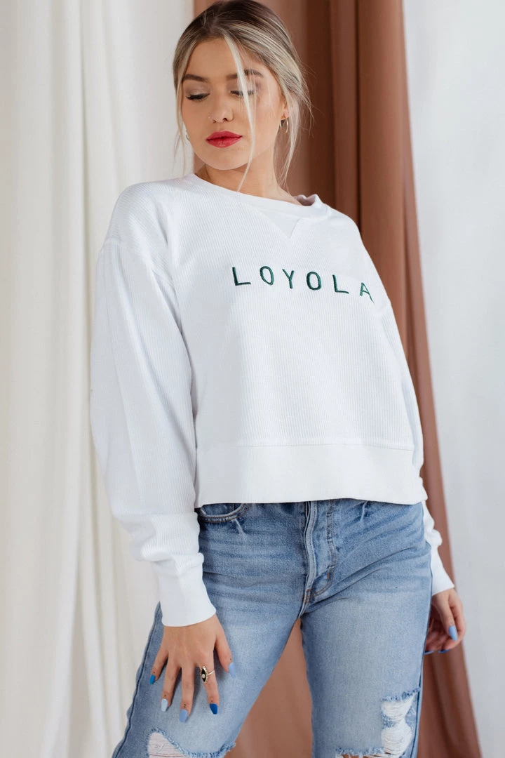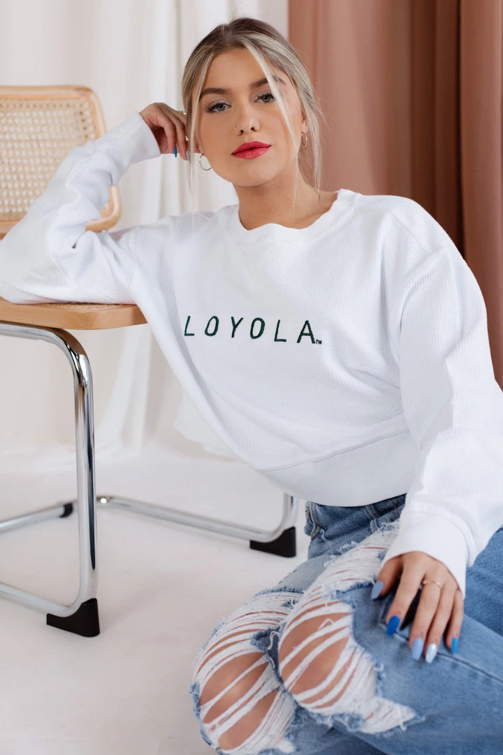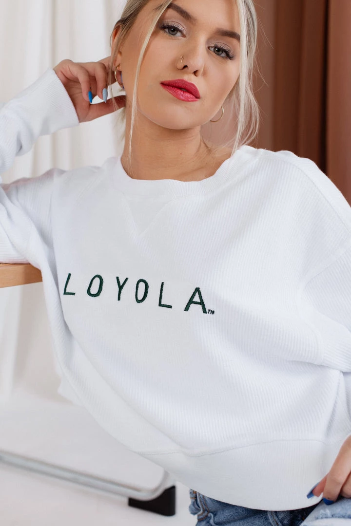 We are living in this Loyola Cropped Crew! Featured in green embroidered detail and soft cord material.
