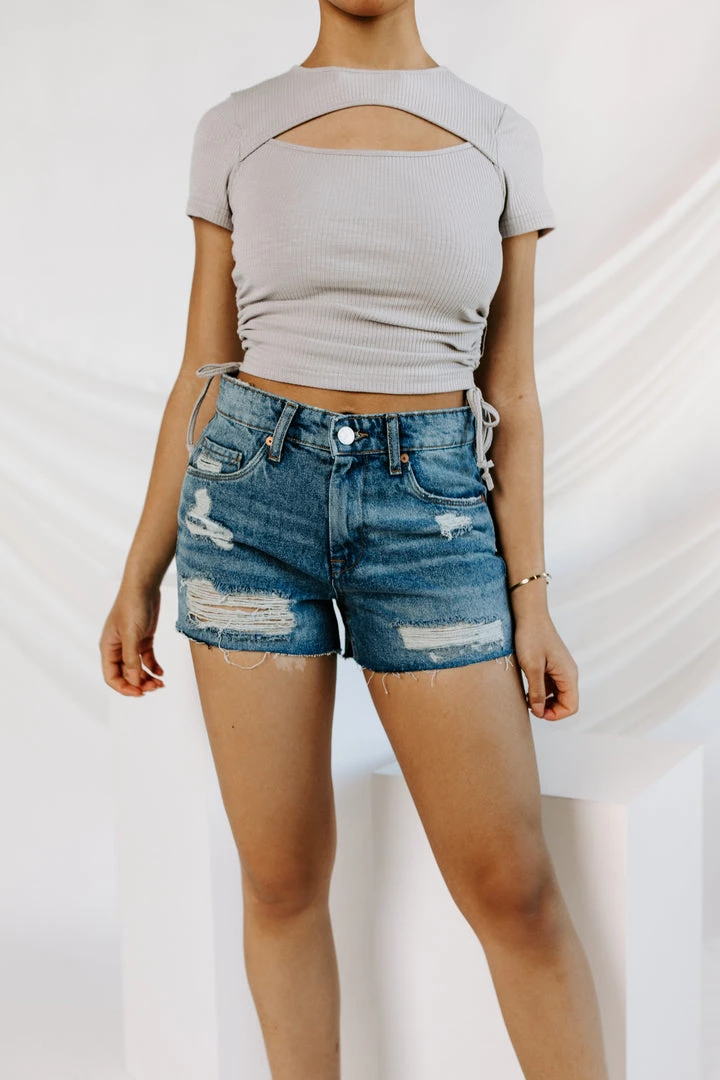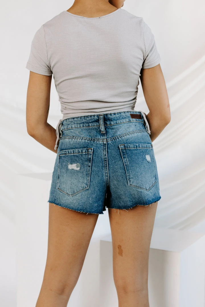 The Barrow high-rise short in medium light wash with shadow pocket detail.