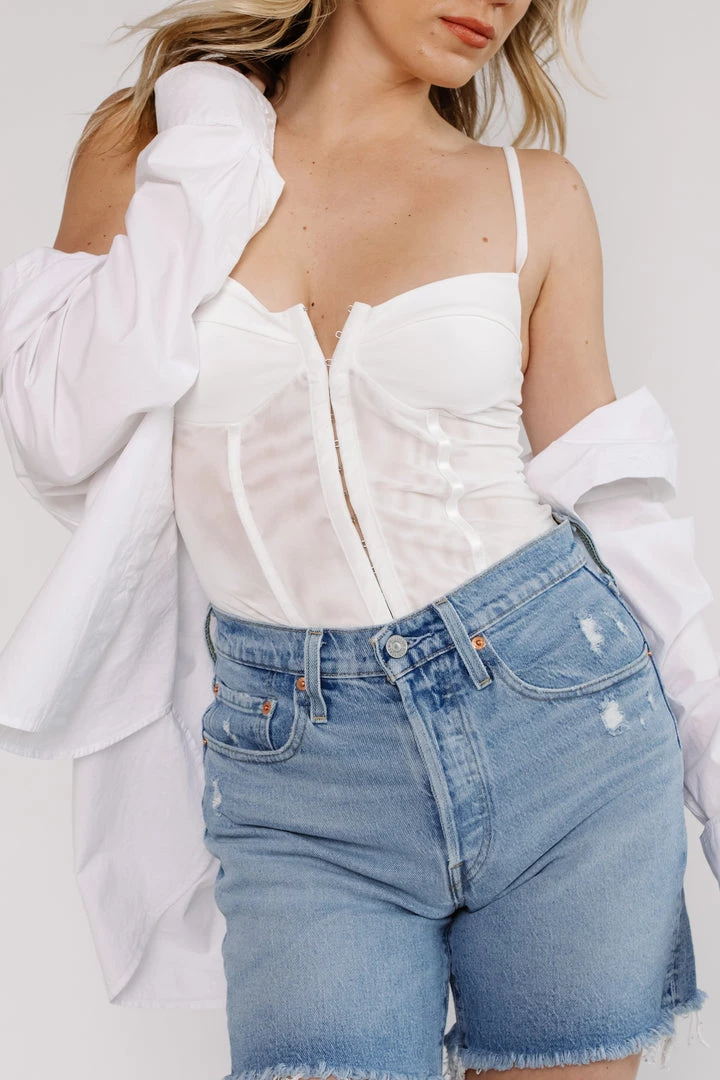 Soft and sultry in a corset silhouette, this bodysuit features a seamed cup design with a mesh bodice and hook-and-eye front closures for added dimension.