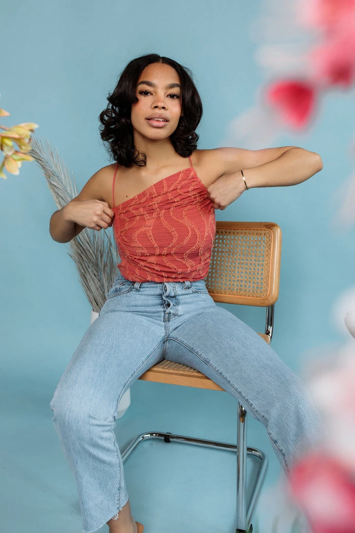 Your new go-to tank featuring an asymmetric neckline with textured printing throughout and exaggerated ruching for added dimension.