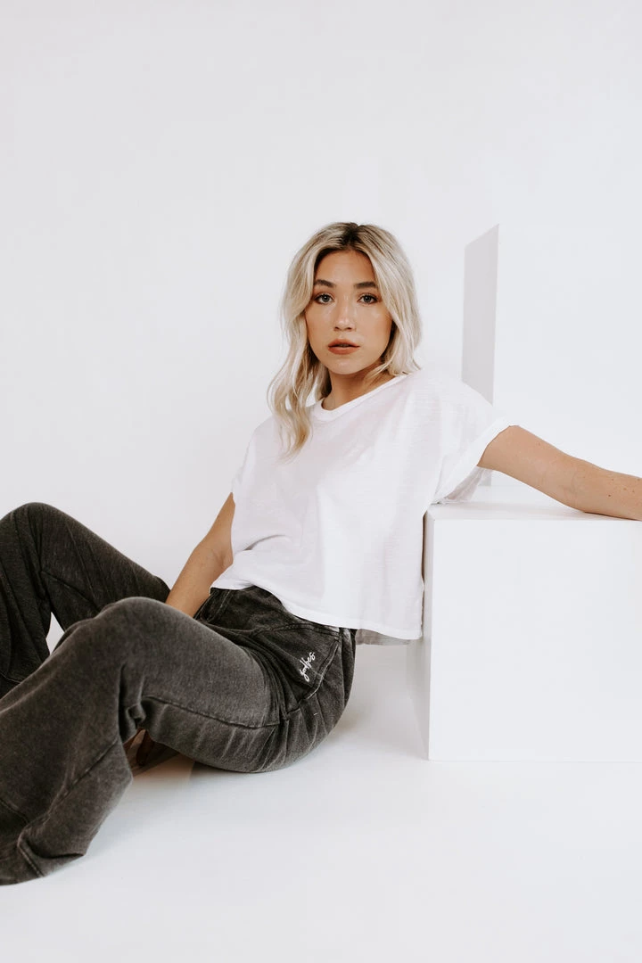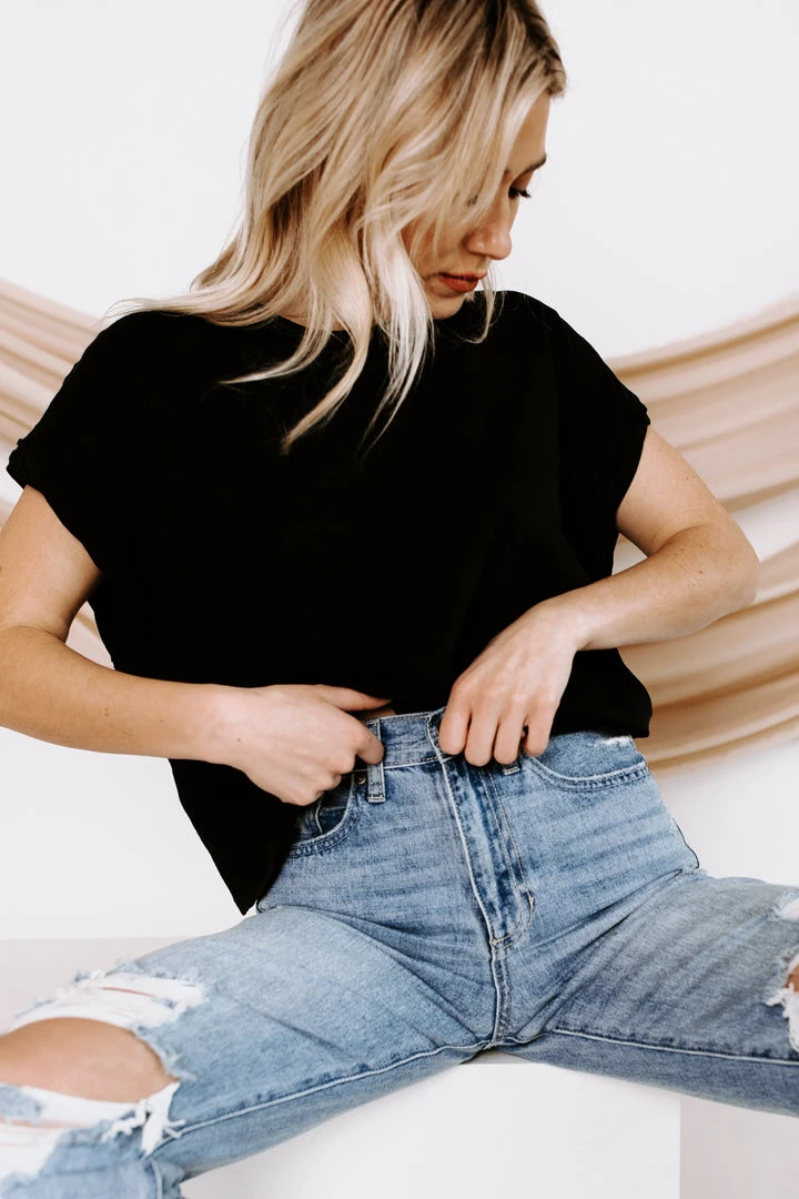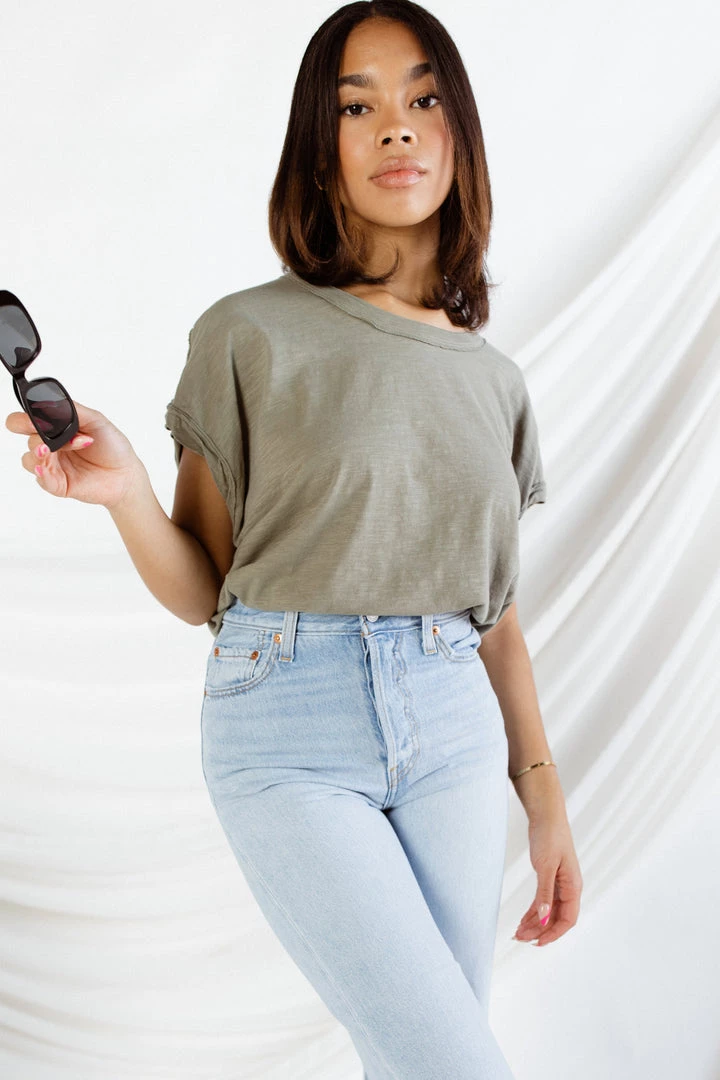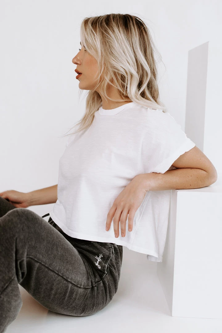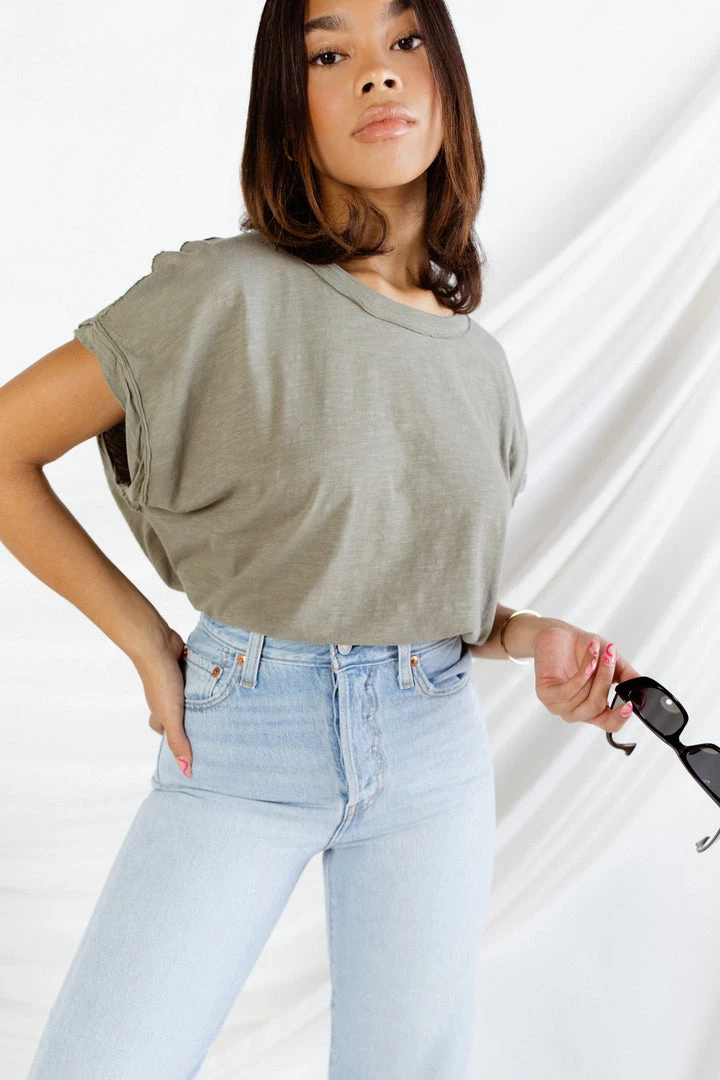 An effortless essential for everyday style, this perfect vintage-inspired tee is featured in a boxy, cropped silhouette with rolled sleeve cuffs for added dimension.