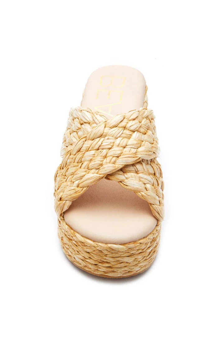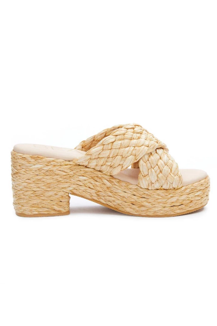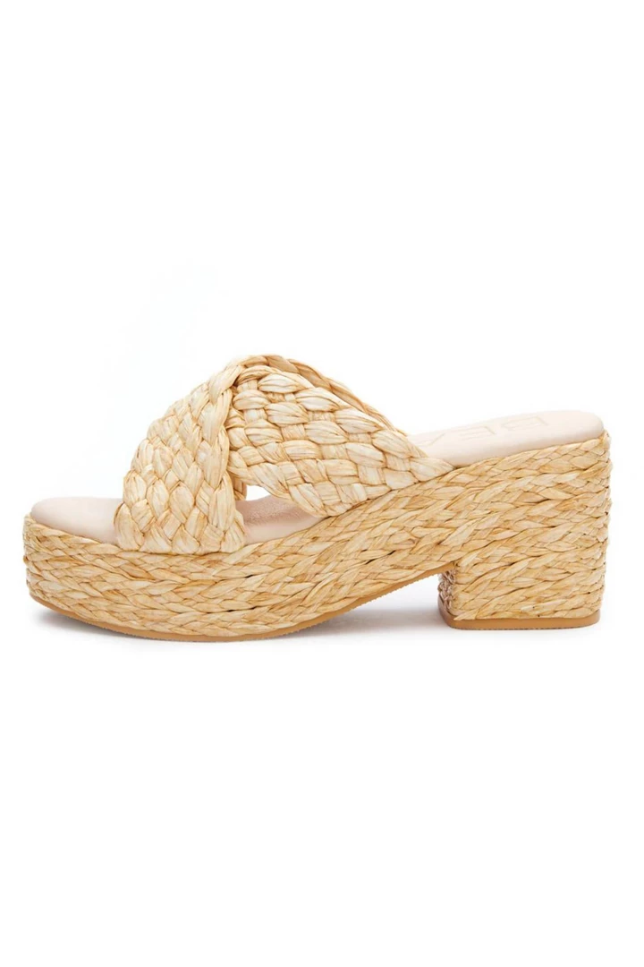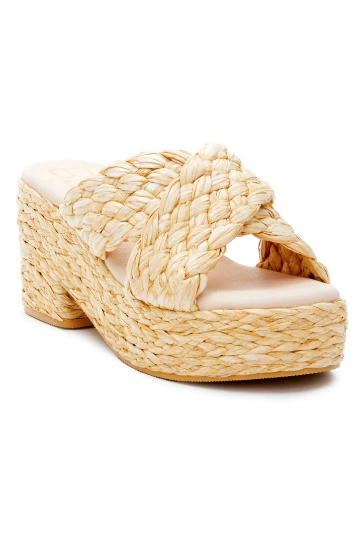 Vegan, woven raffia block heel platform sandal.