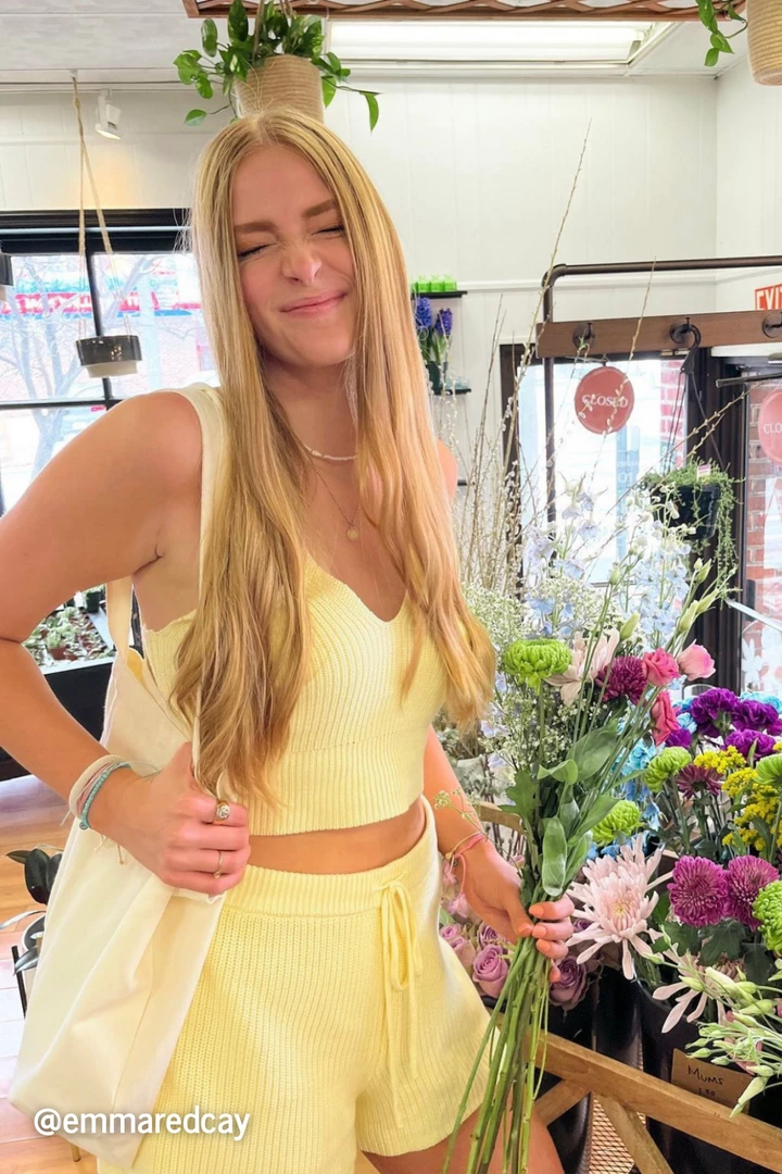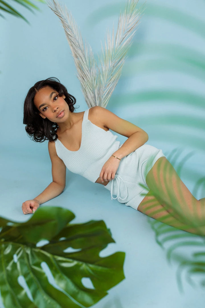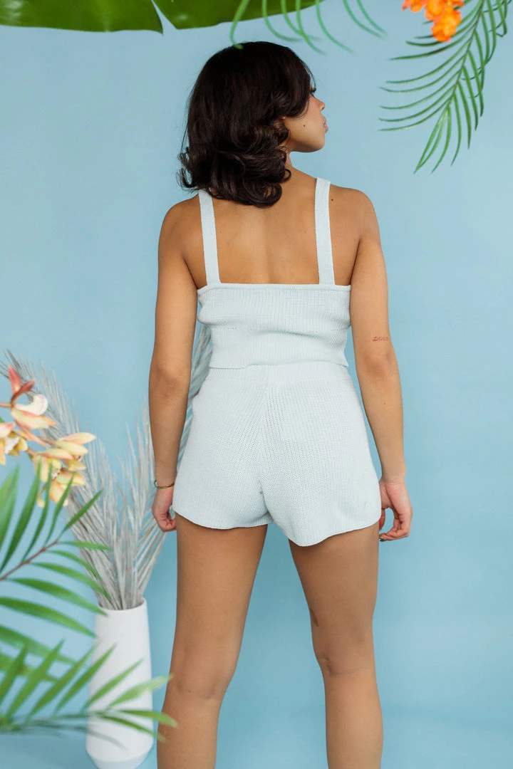 This sweater cami is a must-have! Made from our knit sweater yarn fabric in spring pastels, the fitted knit Summer Sweater Cami is a bralette that has a wide bottom band to keep it place and give moderate support. Complete the set with the Brianna Sweater Short.