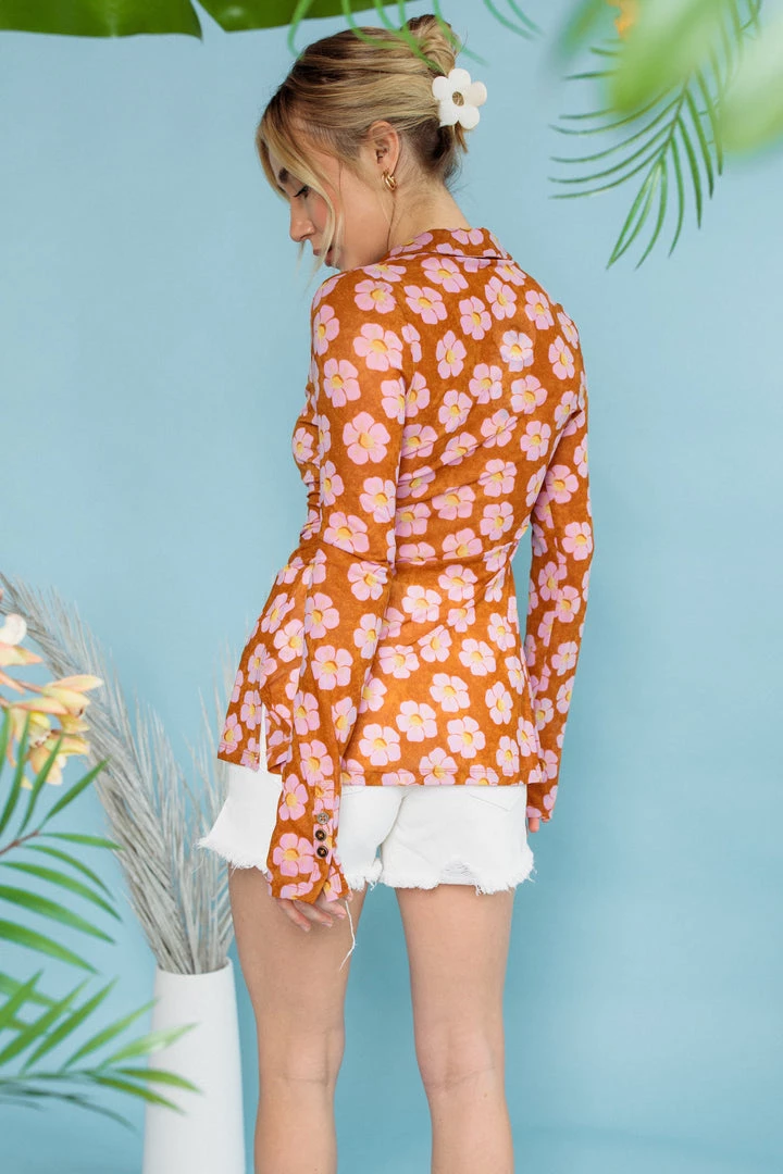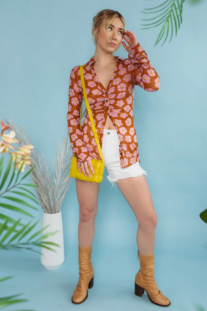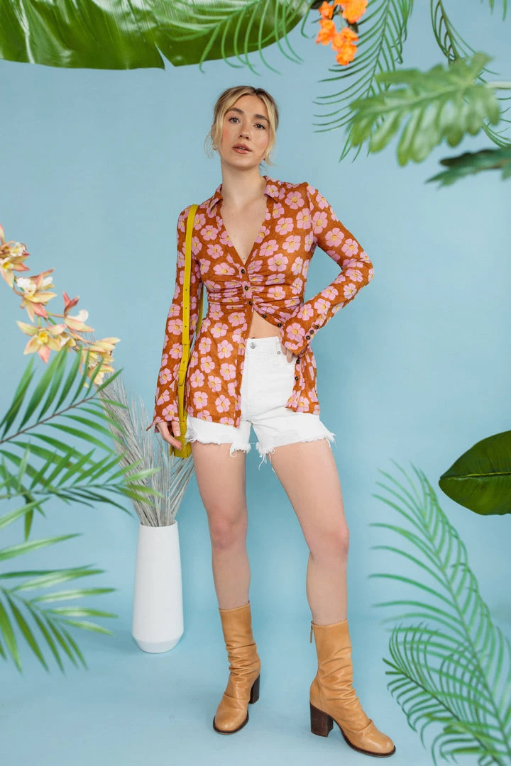 Stand out in this so special button-front top featured in a bold, retro-inspired print with ruching at center for added dimension.