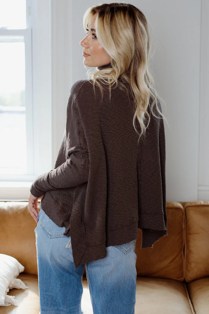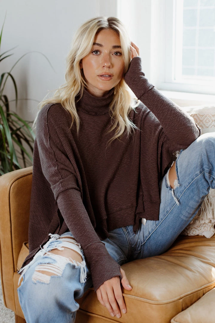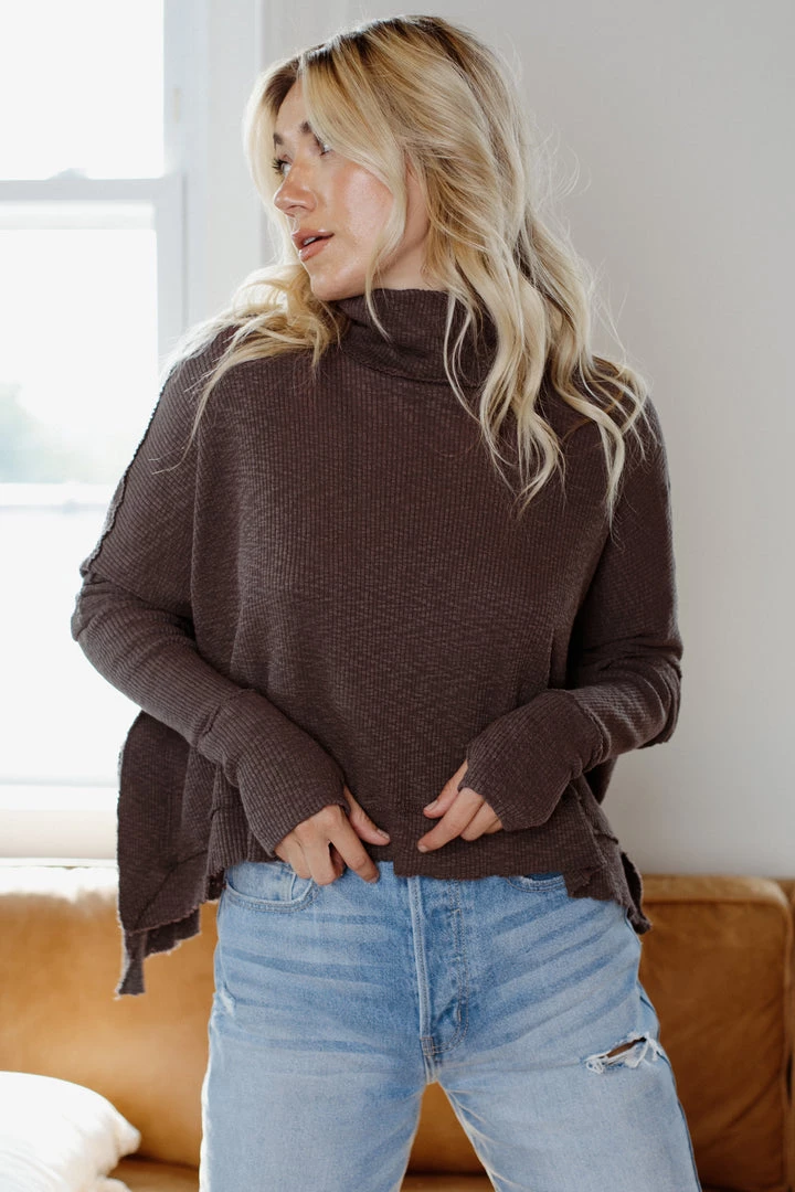 Add effortless edge to any look with this so cool and slouchy pullover featuring mock neckline and exposed seaming throughout for added dimension.