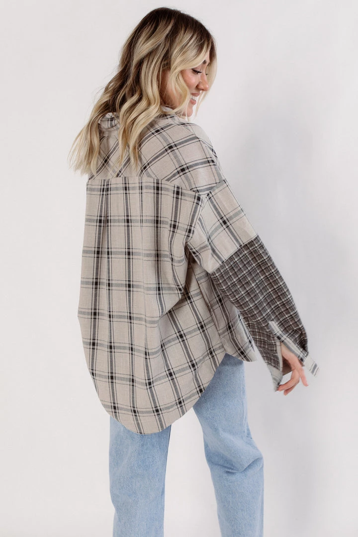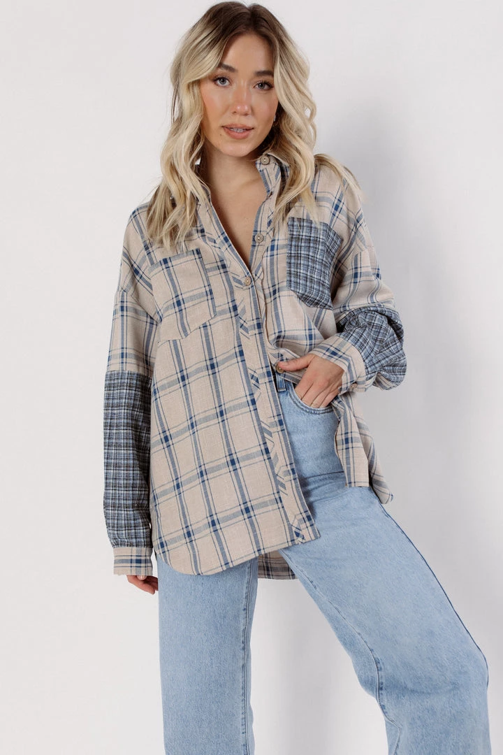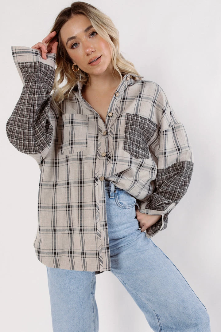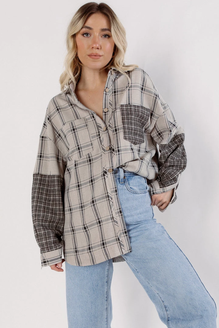 Perfect in plaid, this forever timeless top is featured in a flowy inspired design with button-front and contrast printed patches. Style with denim or leggings for an easy on the go outfit.