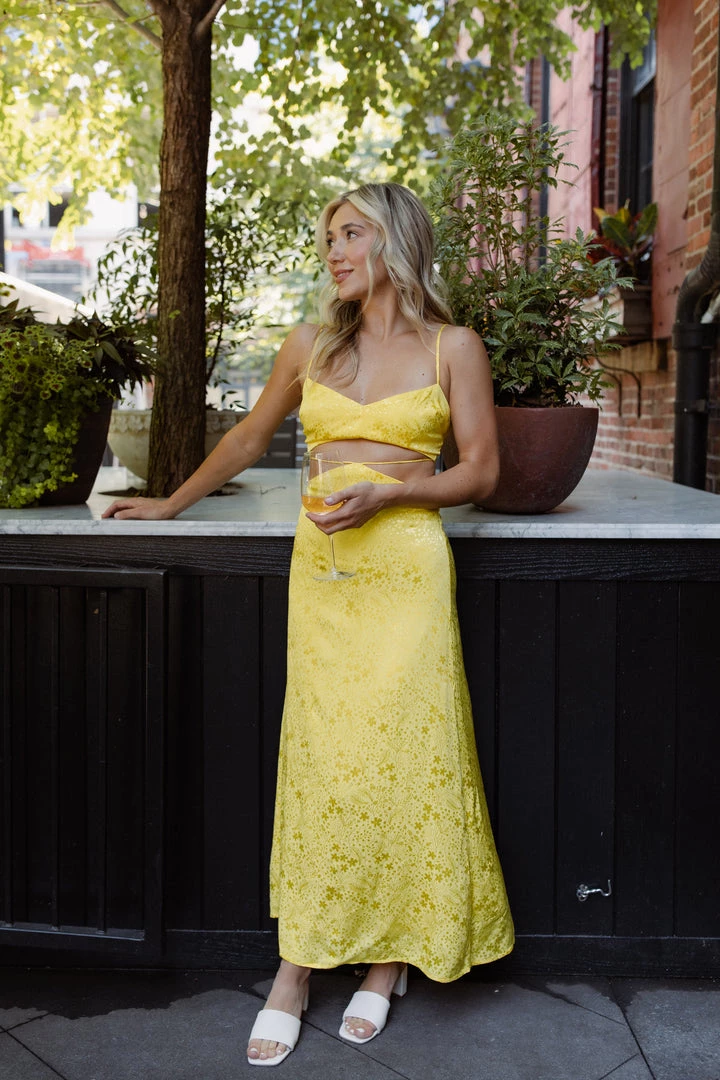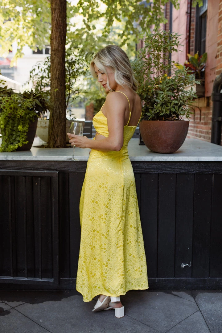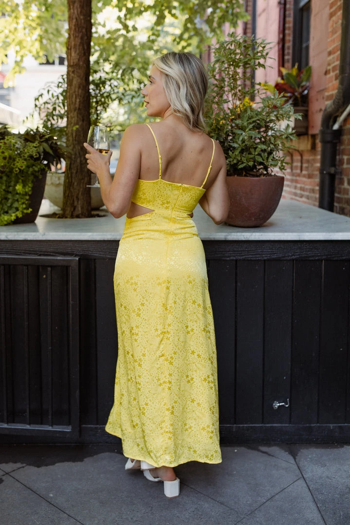 Keep it chic. Featuring a subtle shine, the floral satin jacquard Erik dress offers a midi silhouette with a dramatic cutout waist, statement strap details, and a sexy v-neck silhouette. She comes in a yellow floral patterned satin jacquard.