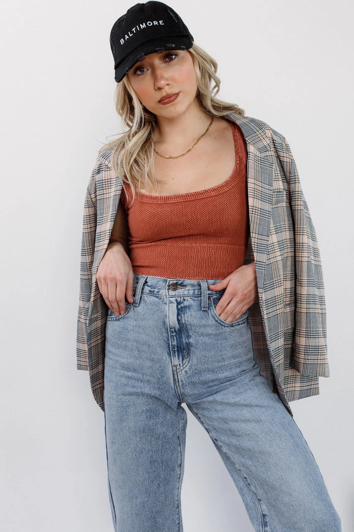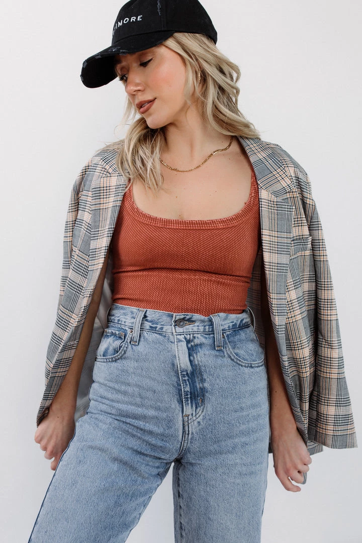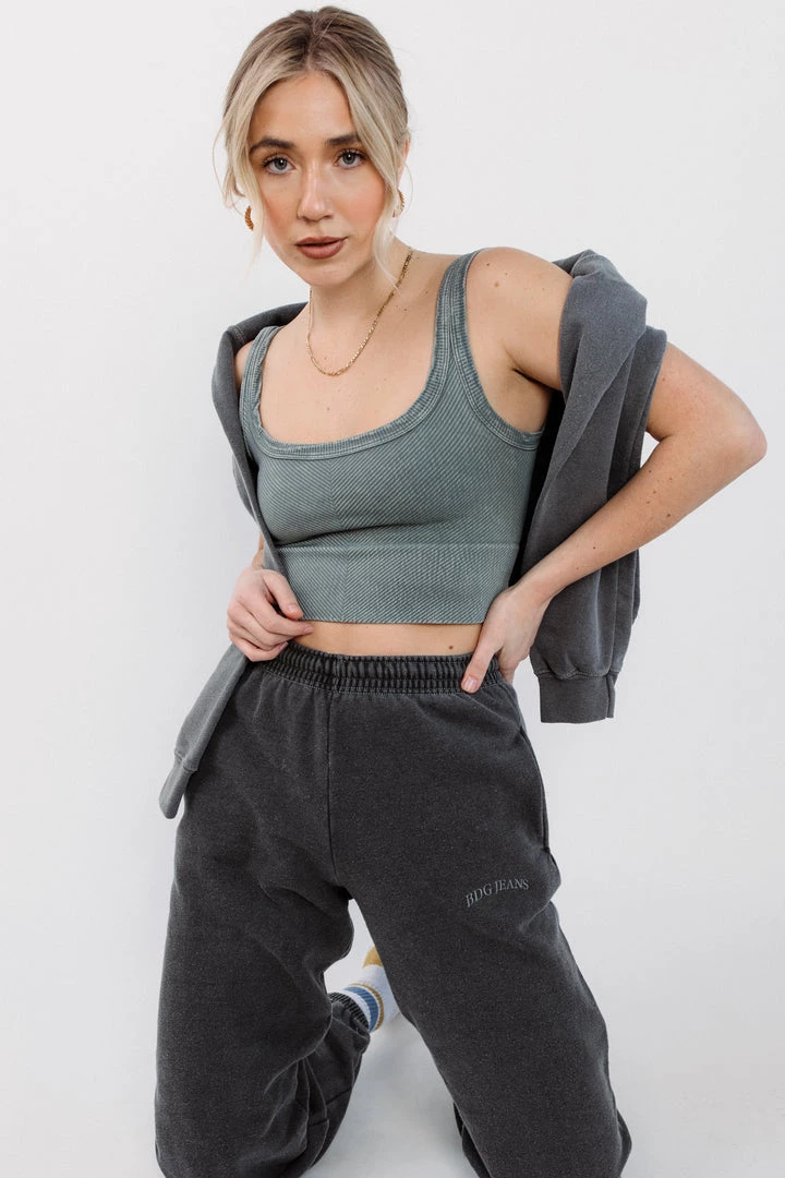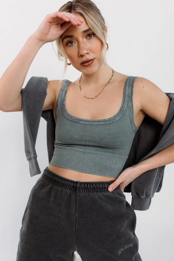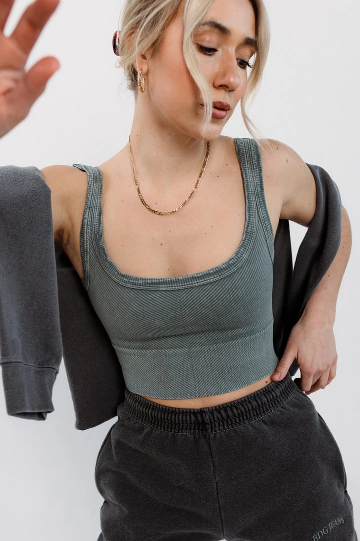 The Time To Trim crop top is a fitted crop top with a v-style ribbed design. Easy for an everyday on-the-go look.
