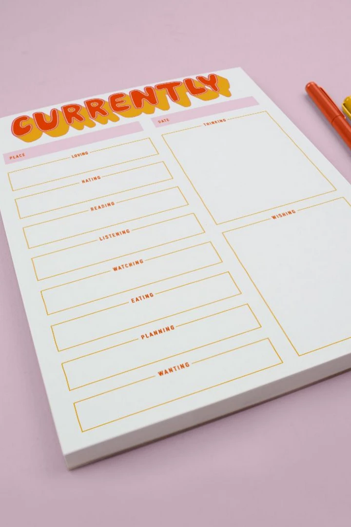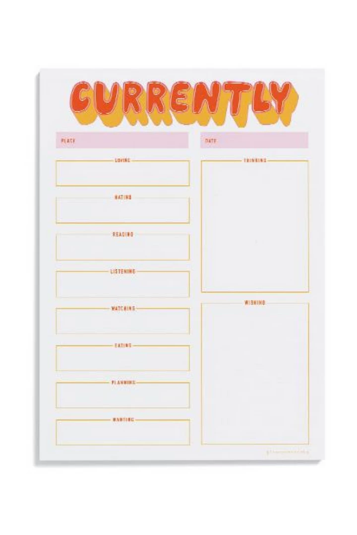This pretty, Currently notepad is just the thing to keep your to-do list in order, jot down brilliant ideas or doodle during your next conference call!