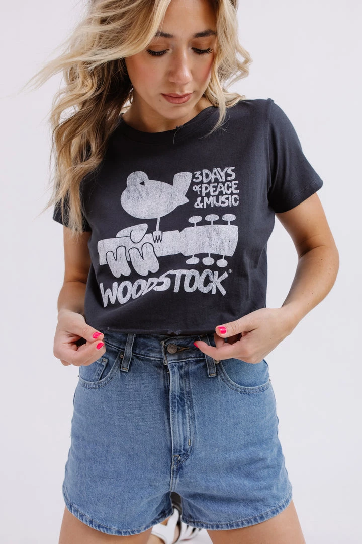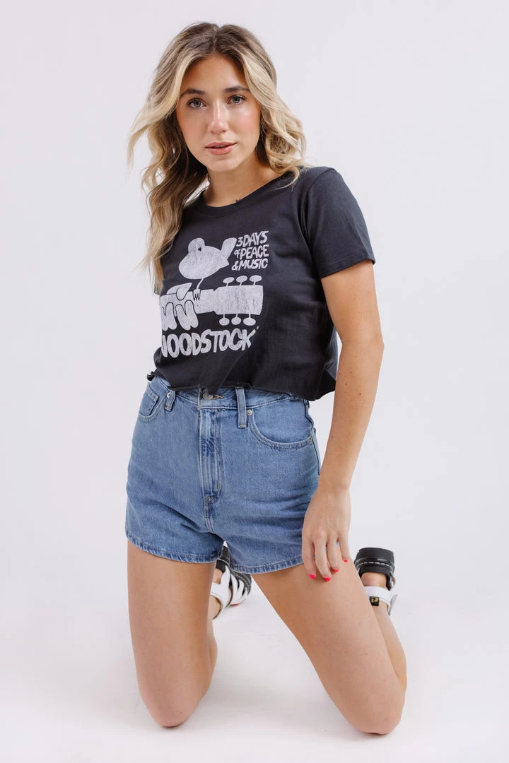Featured with an unfinished hem, distressing, and cropped fit – you’ll be rocking out in this pick again and again. The Woodstock Poster Crop Tee is the perfect piece to toss on with a pair of denim shorts to head out and run errands or fun flares for a girls night out.