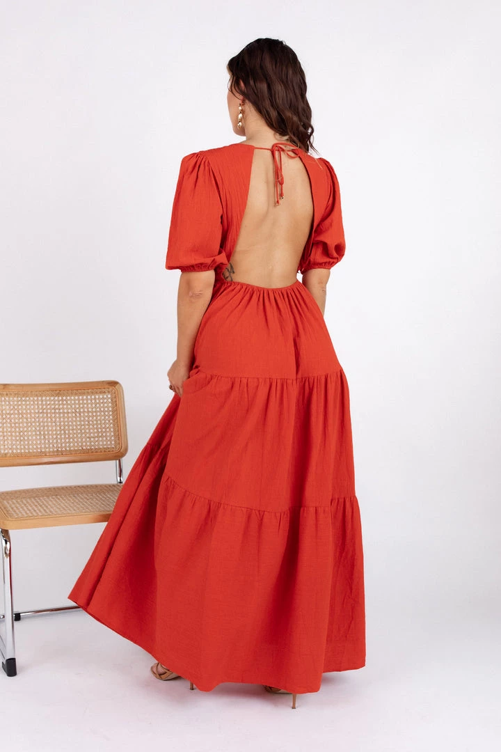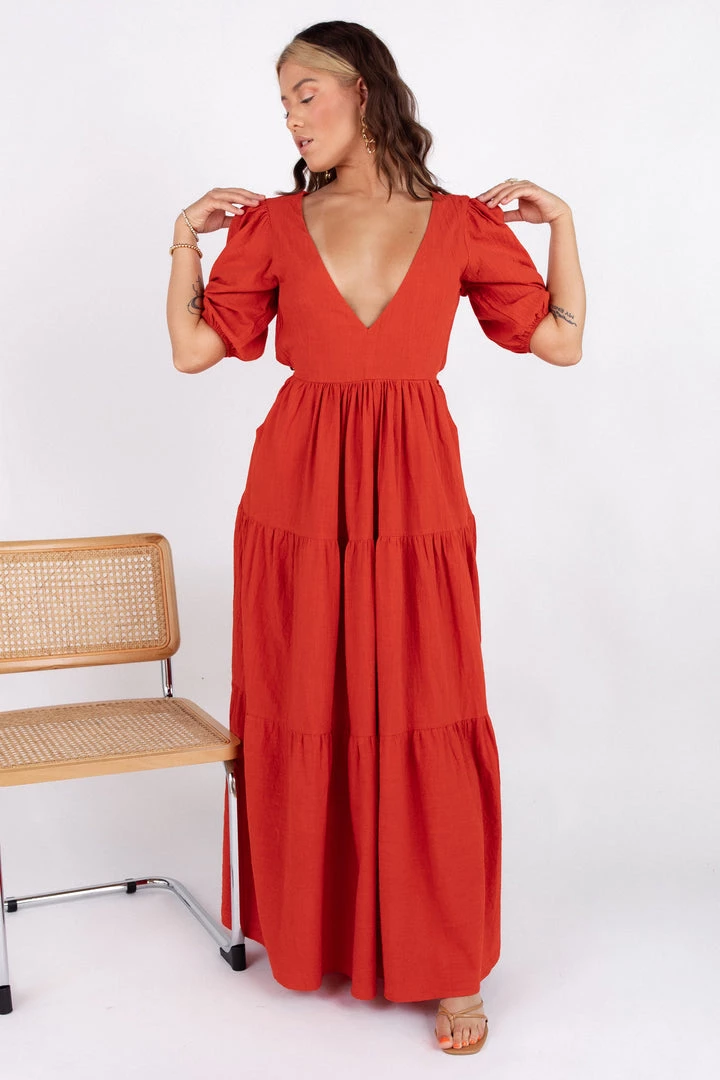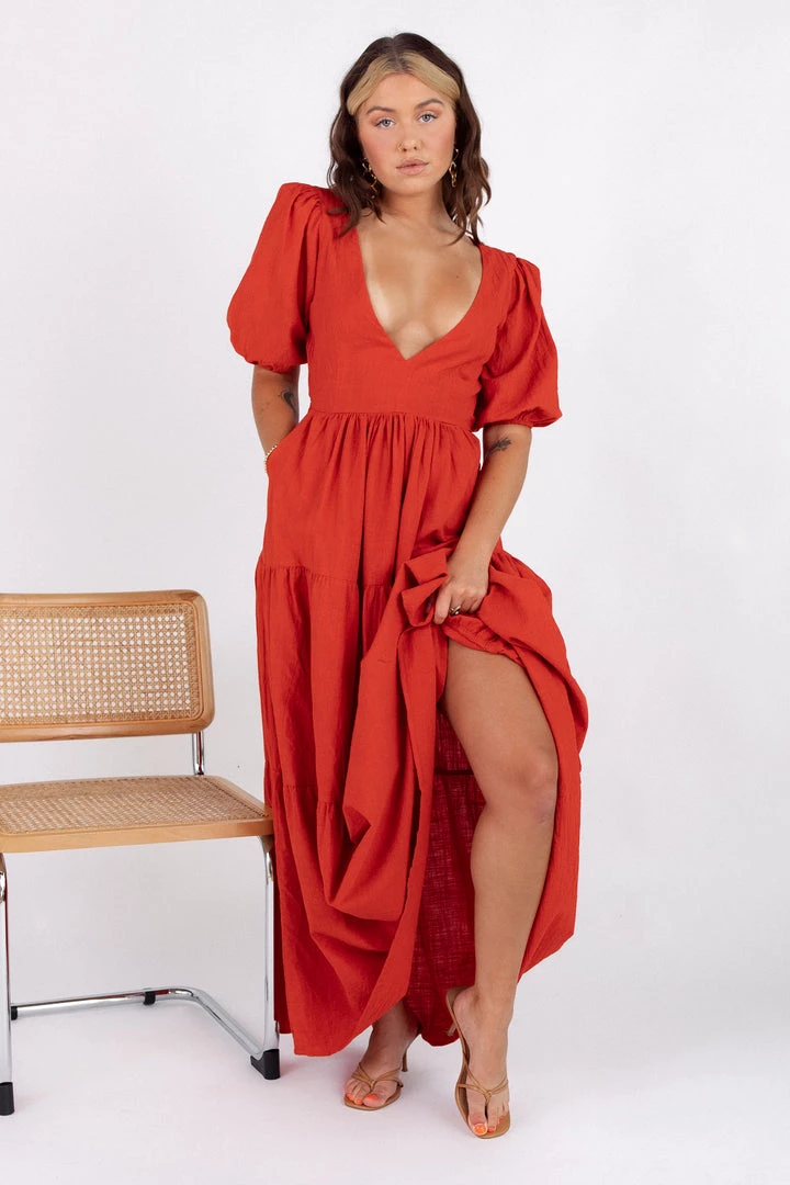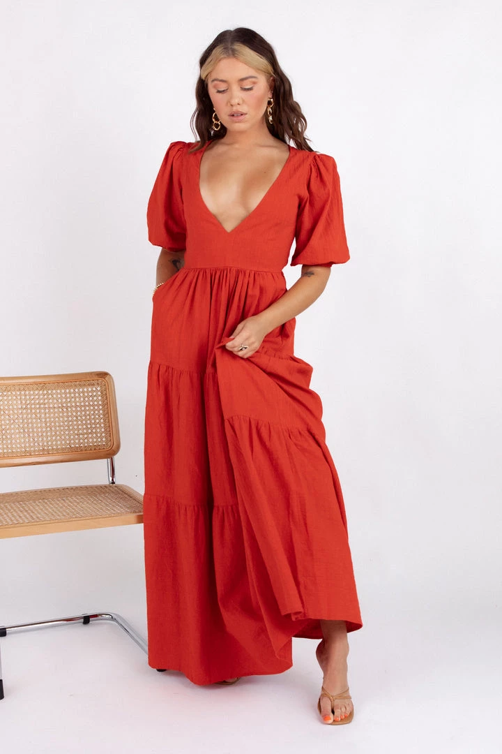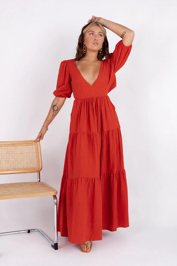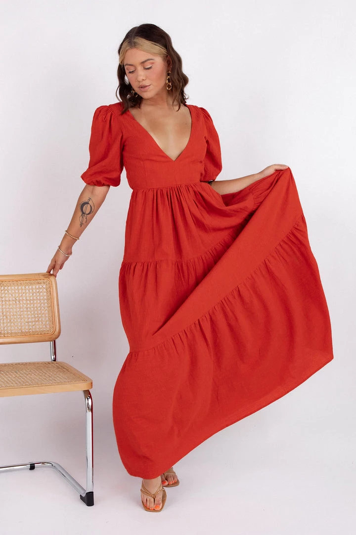 The Asha Maxi Dress adds color to a bohemian style maxi. Featured with puff sleeves, tiered details, and a breezy silhouette, this dress takes things to the next level.