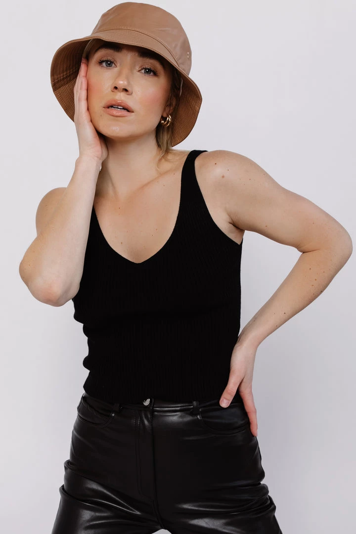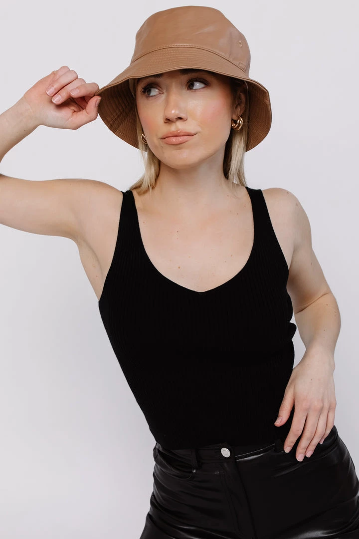 This vegan leather bucket hat adds a bad gal vibe to your favorite looks. Feautres a flat top and flared brim.