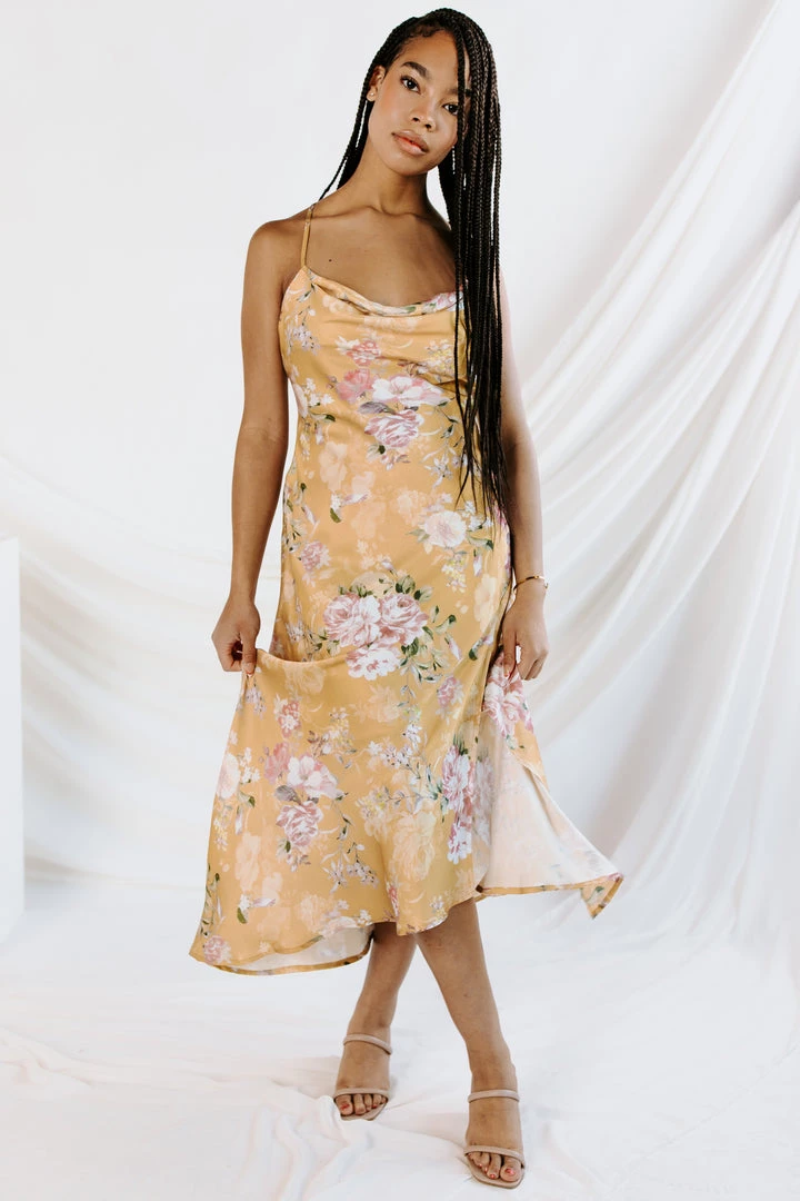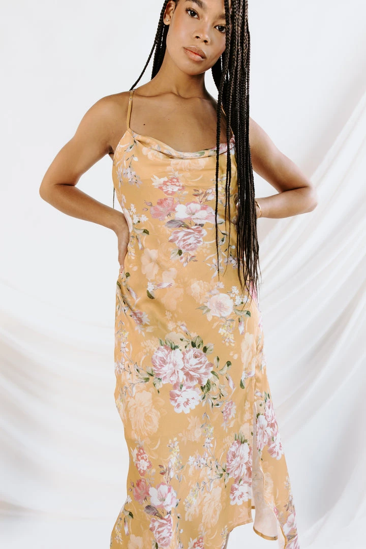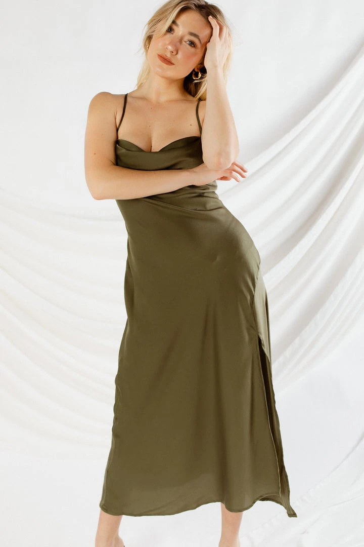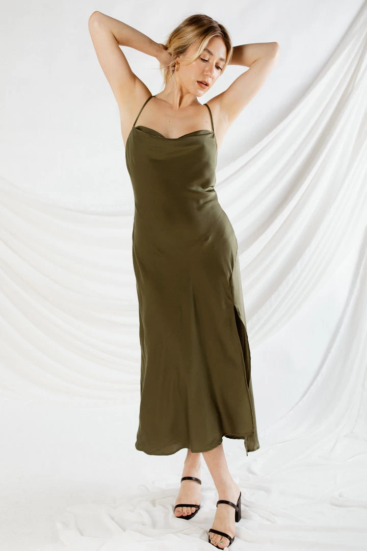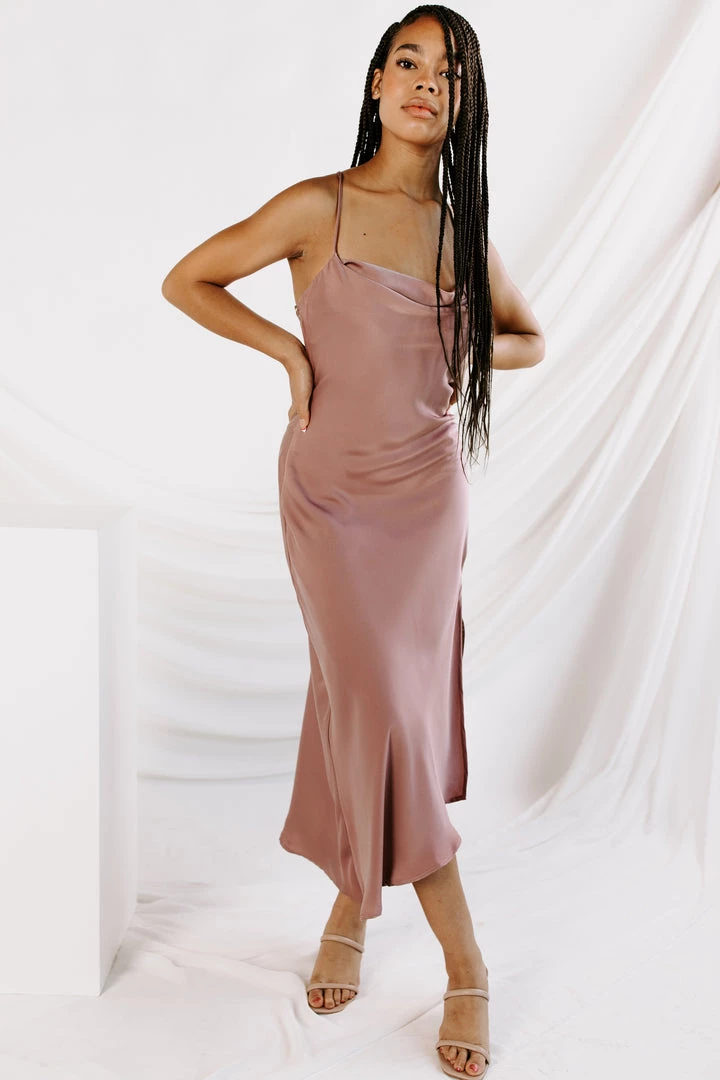 Slip into sexy with the ASTR Gaia Dress. This dreamy silk midi dress is everything you need for long summer nights. The cowl neckline accentuates the bust and is supported by skinny shoulder straps while the fitted bodice descends to a relaxed midi skirt with a front slit accent to make this dress your choice for a romantic night out.