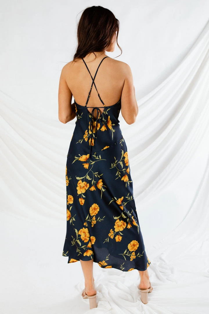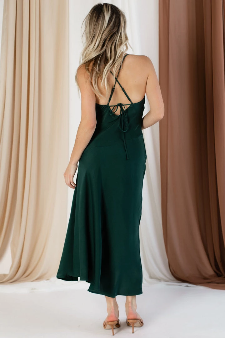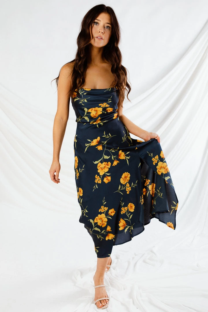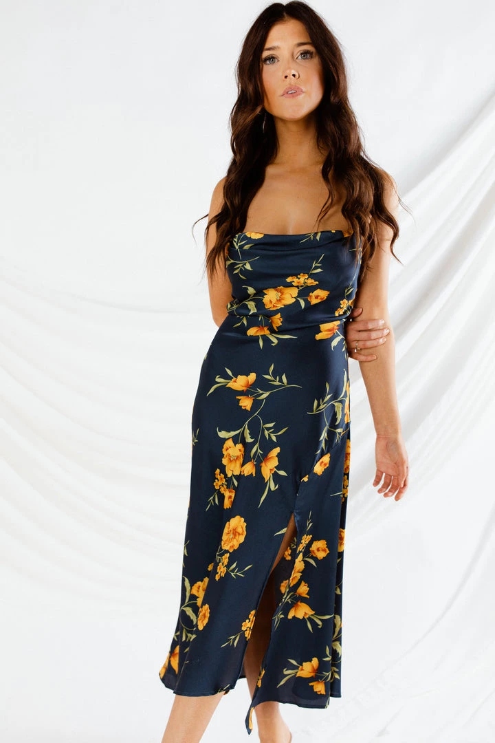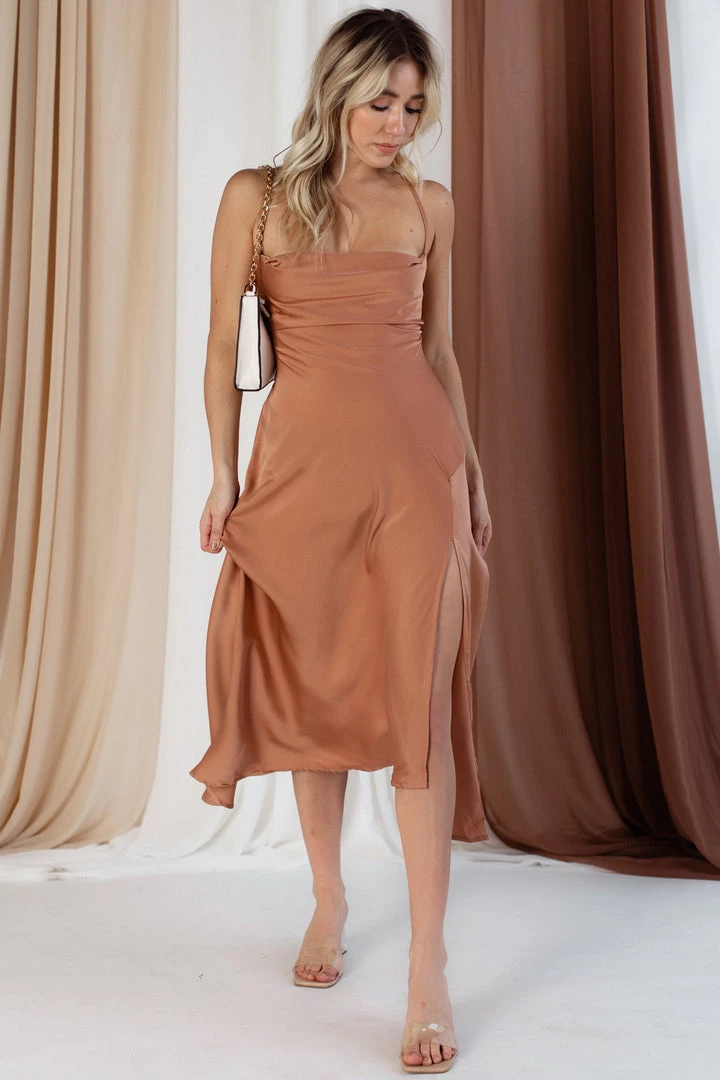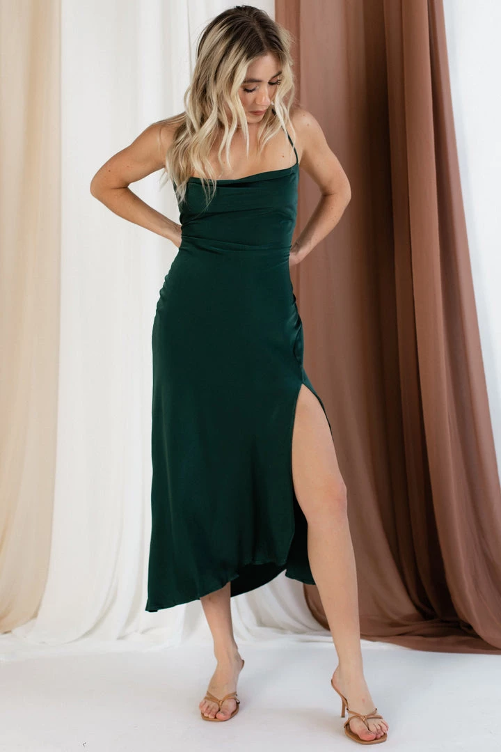 Slip into sexy with the ASTR Gaia Dress. This dreamy silk midi dress is everything you need for long summer nights. The cowl neckline accentuates the bust and is supported by skinny shoulder straps while the fitted bodice descends to a relaxed midi skirt with a front slit accent to make this dress your choice for a romantic night out.